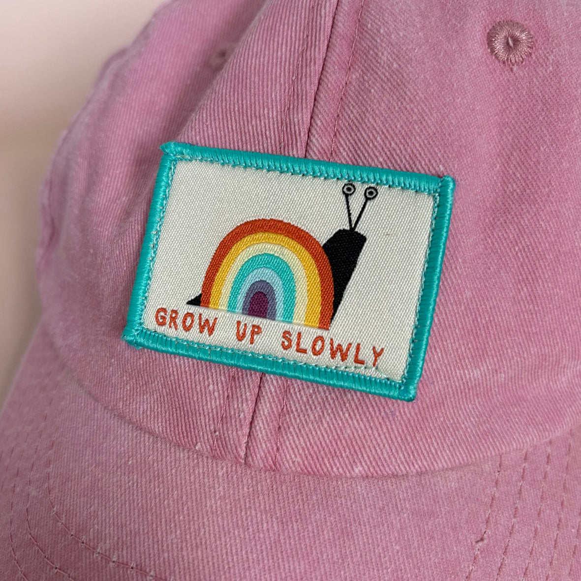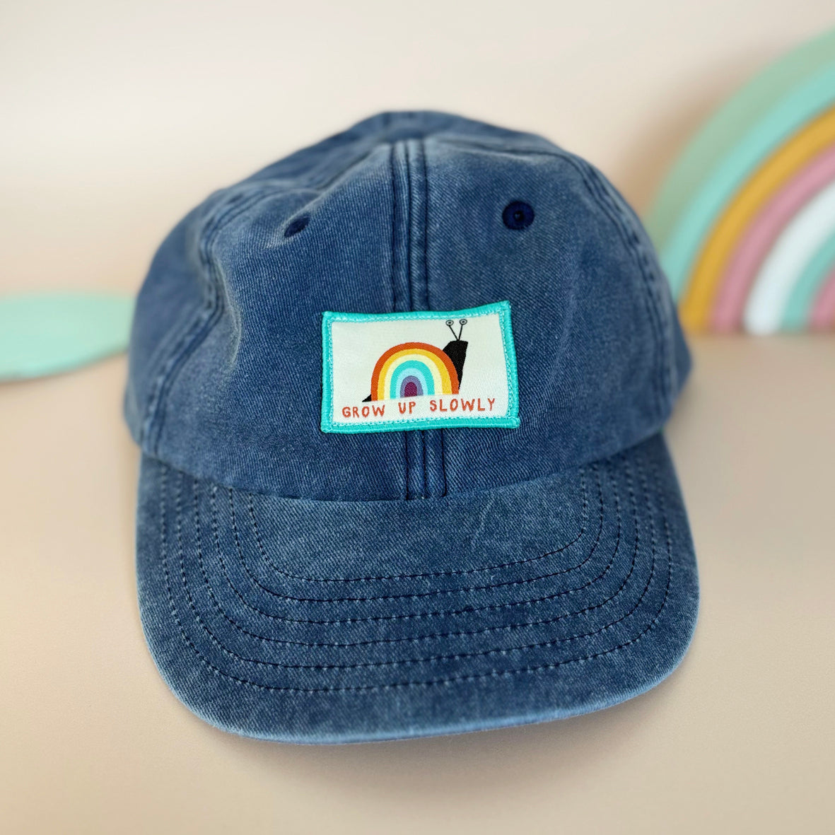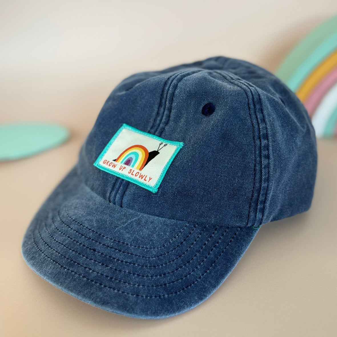 With our favourite message — Grow Up Slowly — little ones are ready for summer adventures in this timeless vintage-style cap.