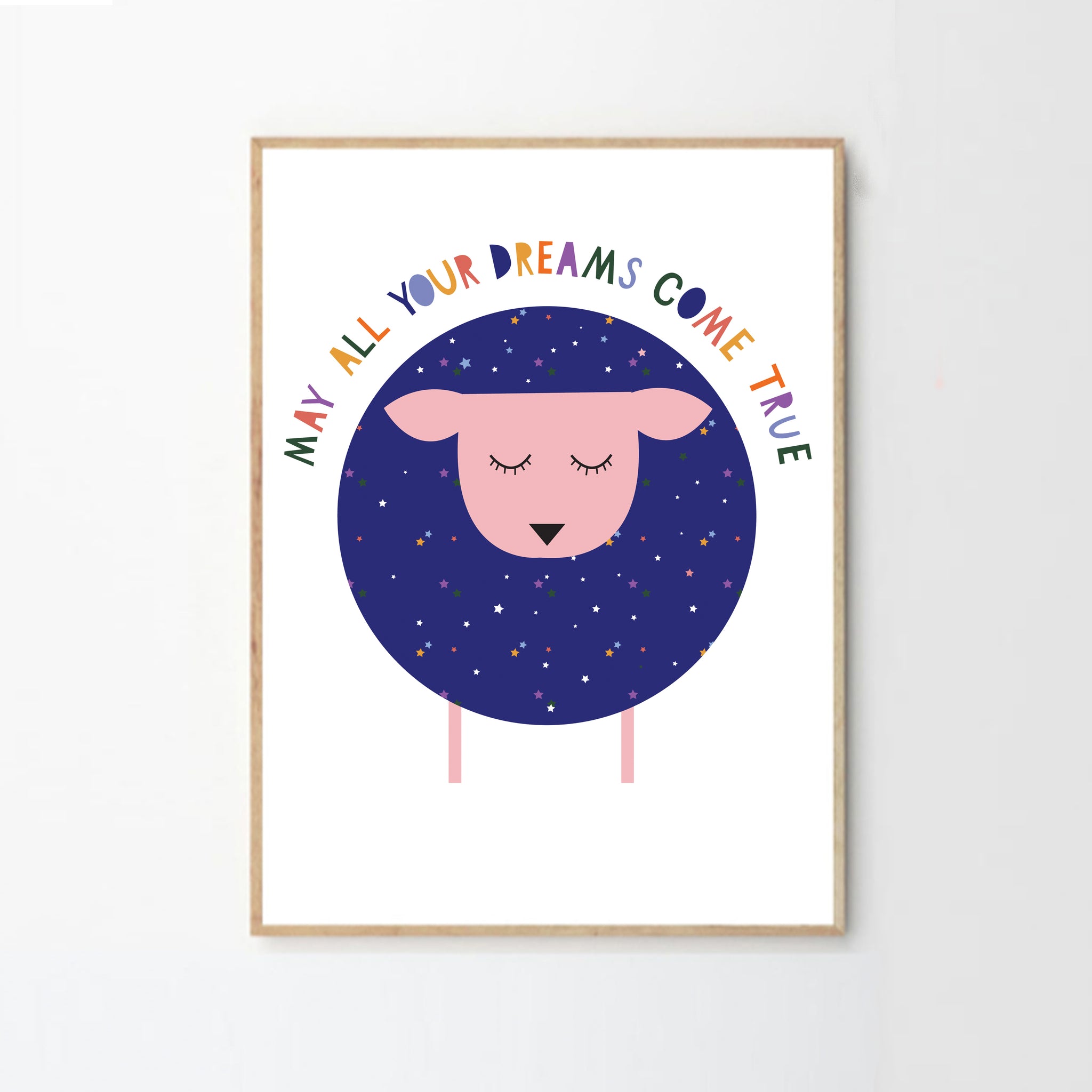 A wonderful print for any child with a wonderful message - May all your dreams come true and a beautiful sheep illustration.